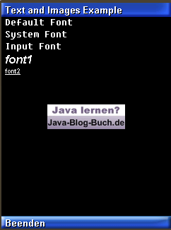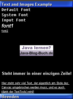 Beachten Sie, dass jeder Font auf jedem Gerät unterschiedlich aussieht. Möchten Sie an die spezifische Breite oder Höhe eines Textes kommen, können Sie die Höhe allgemein über font.getHeight() bzw. die Breite textspezifisch über font.stringWidth("My String") abfragen. Ein kleines Beispiel in unserem TextAndImageCanvas: