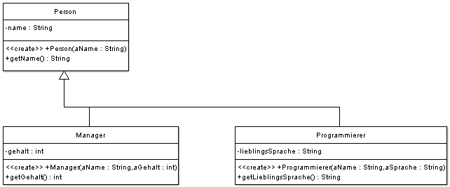 erzeugeMenschhat, die einen Menschen zurückliefert, dann kann man ja nicht einfach schreibenAngestellter a = Mensch.erzeugeMensch();Denn ein Mensch ist kein Angestellter und hat somit auch kein Gehalt. Das Gehalt wäre also undefiniert. Umgekehrt würde natürlich