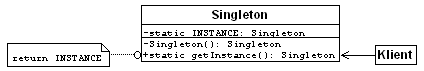 Dies funktioniert am Ehesten, wenn eine Klasse selbst ihre eigenen Zugriffsmöglichkeiten steuert. Sie hat einen privaten Konstruktor, so dass von Außen kein neues Objekt von ihr erzeugt werden kann. Außerdem hat sie eine statische, private Instanz von sich selbst. Auf diese Instanz kann über einen entsprechenden, statischen Getter zugegriffen werden. Schon sind die Anforderungen an einen Singleton erfüllt. Machen Sie sich den Sachverhalt nochmals am Diagramm deutlich: