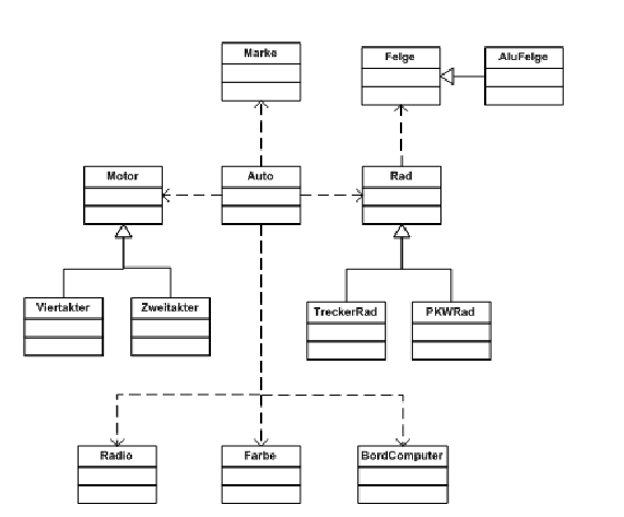 Mittels Dependency Injection werden Objektnetze konstruiert – also ein Objekt einer Klasse mit all seinen direkten und transitiven Abhängigkeiten. Als Beispiel für so ein Objektnetz soll ein Klassiker der Literatur über Objektorientierung dienen: das Auto. Darstellung 1 zeigt das Auto mit seinen Abhängigkeiten zu Motoren, Rädern und ähnlichen Komponenten.
